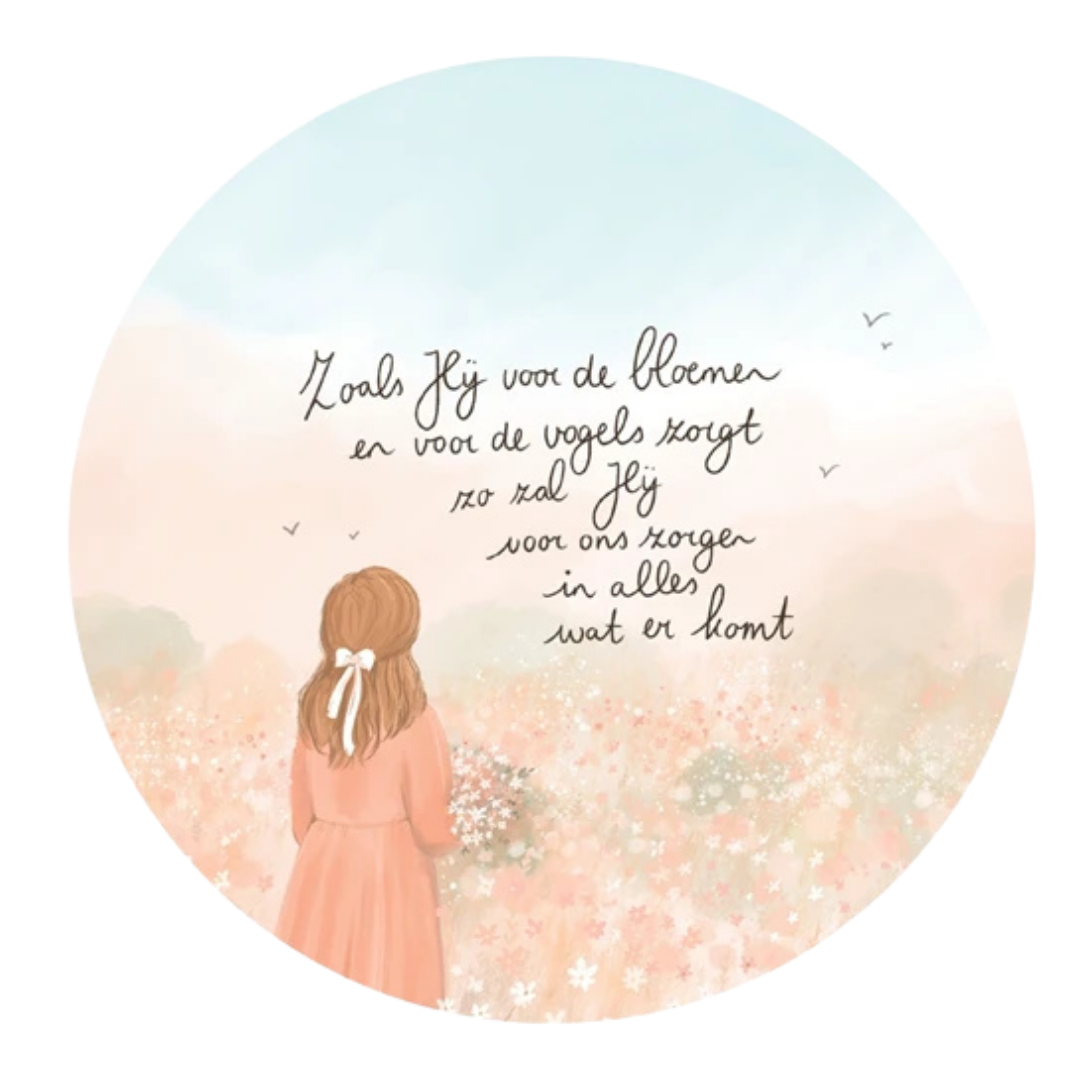 Prachtige muurcirkel met een vrouw in een bloemenveld en de tekst: Zoals Hij voor de bloemen en voor de vogels zorgt, zo zal Hij voor ons zorgen in alles wat er komt. Deze muurcirkel is een prachtige toevoeging voor bijvoorbeeld in de gang of toilet.