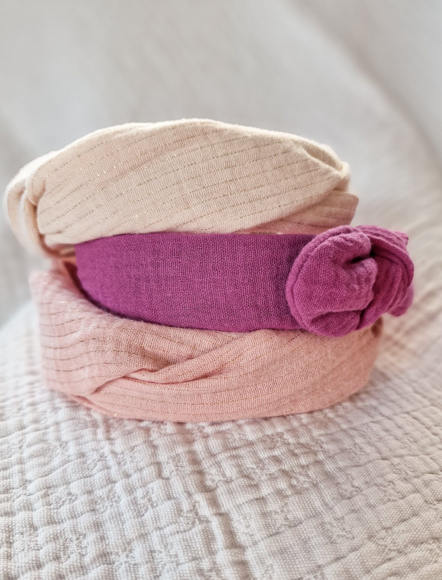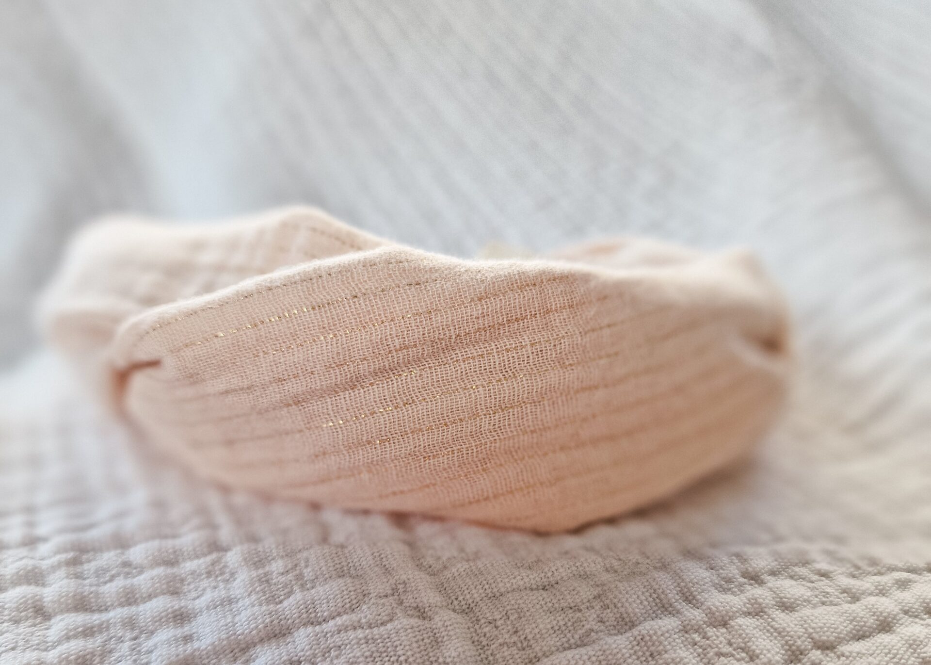 Prachtige handgemaakte diadeem van hydrofiel stof in de kleur beige met goud glittertje.