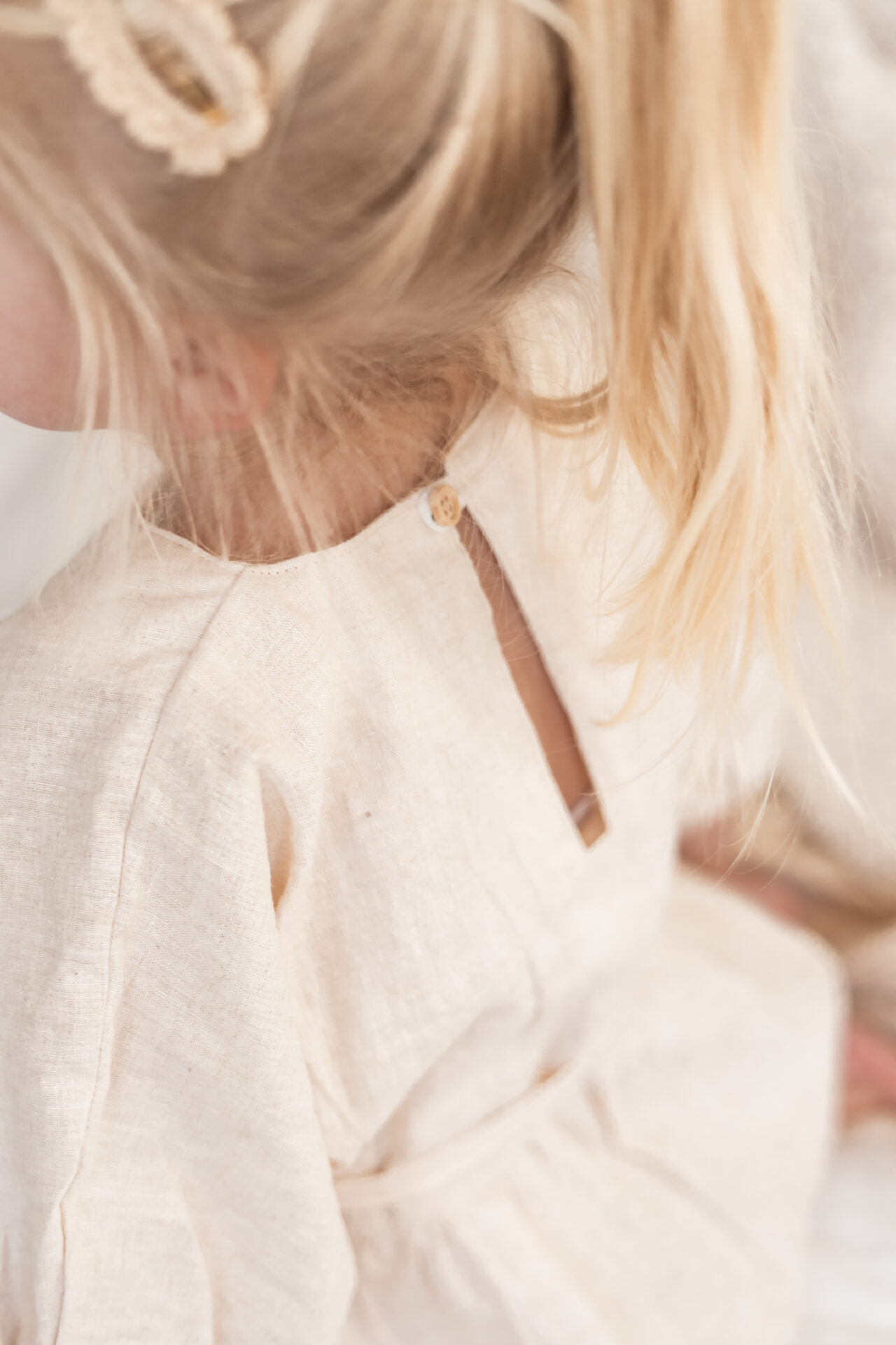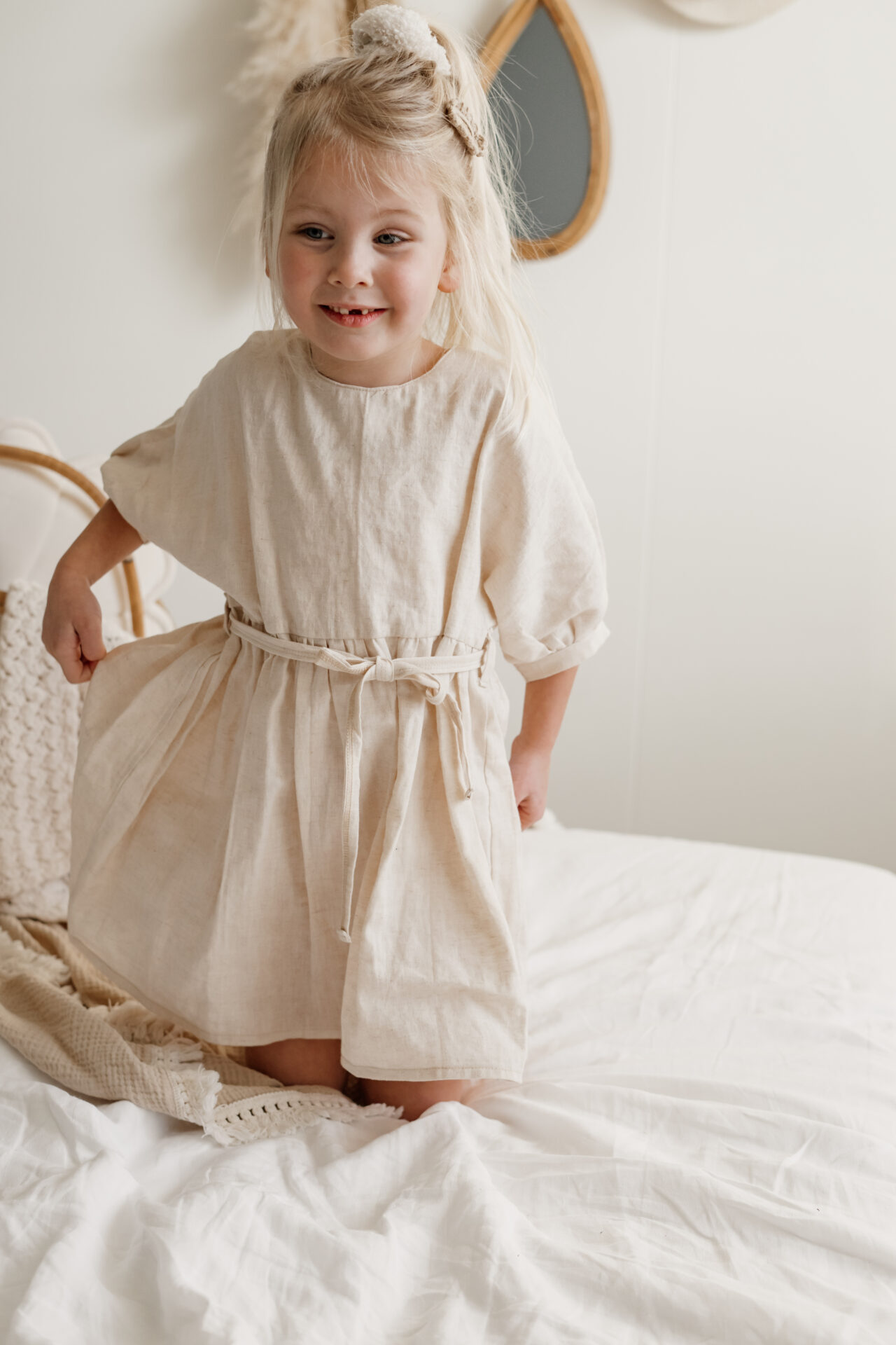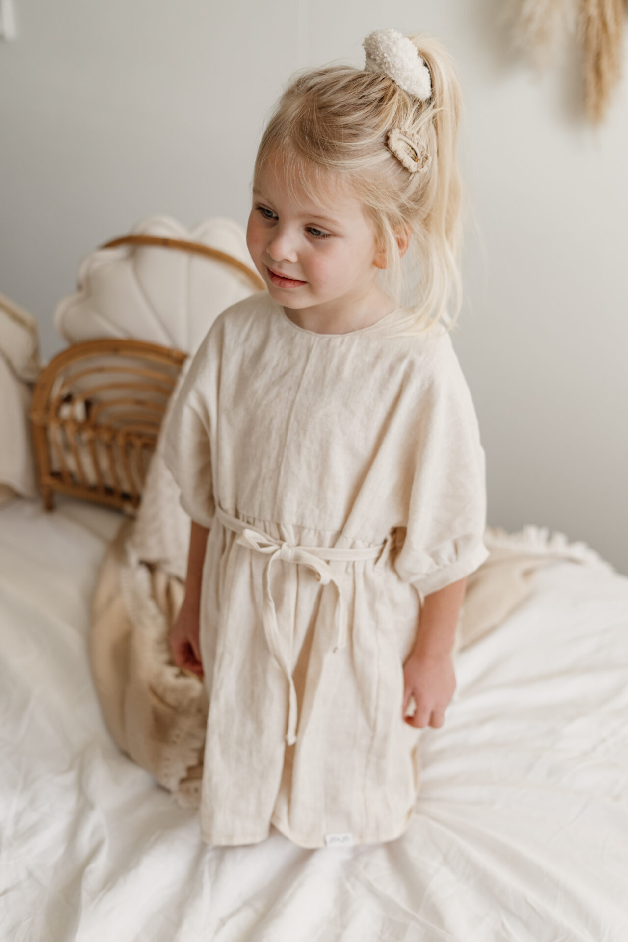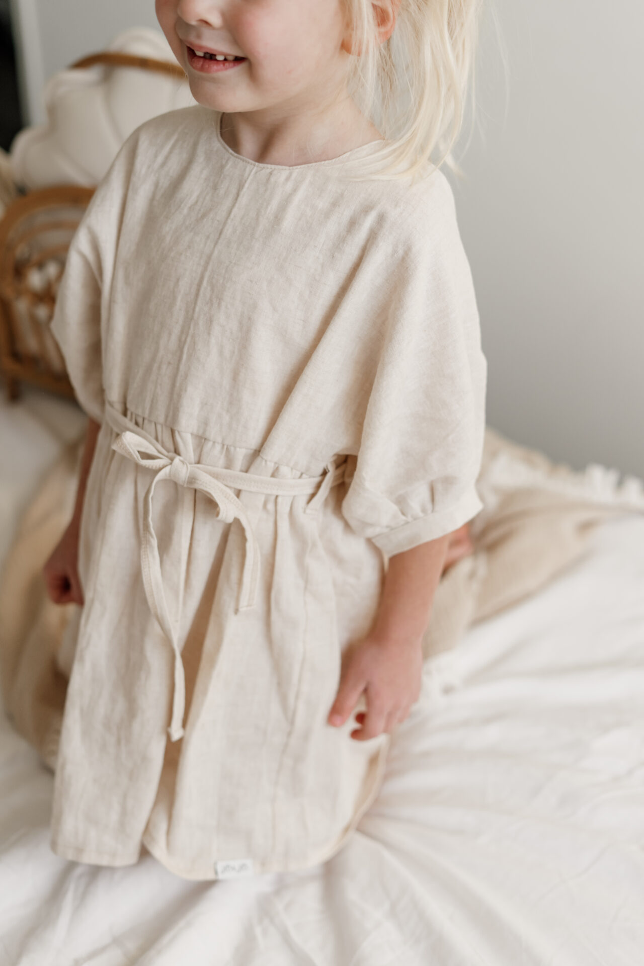 Jurkje Rosa linnen hebben we al een aantal seizoenen in de collectie in diverse kleuren en uitvoeringen. Jurkje Rosa linnen naturel is gemaakt van een stof die uit 100% fijne linnen bestaat, een mooie melange beige kleur. Het meisjes jurkje heeft een tijdloze en chique uitstraling. Het jurkje heeft een wijd model, met wijdlopende mouwen die samenkomen in een biesje. Het jurkje voor meisjes sluit door middel van een knoopje op de rug. Voor zowel jongere als oudere meisjes is dit jurkje een echte topper. Het riempje is gemaakt van dezelfde stof en kan naar eigen wens gebruikt en geknoopt worden.