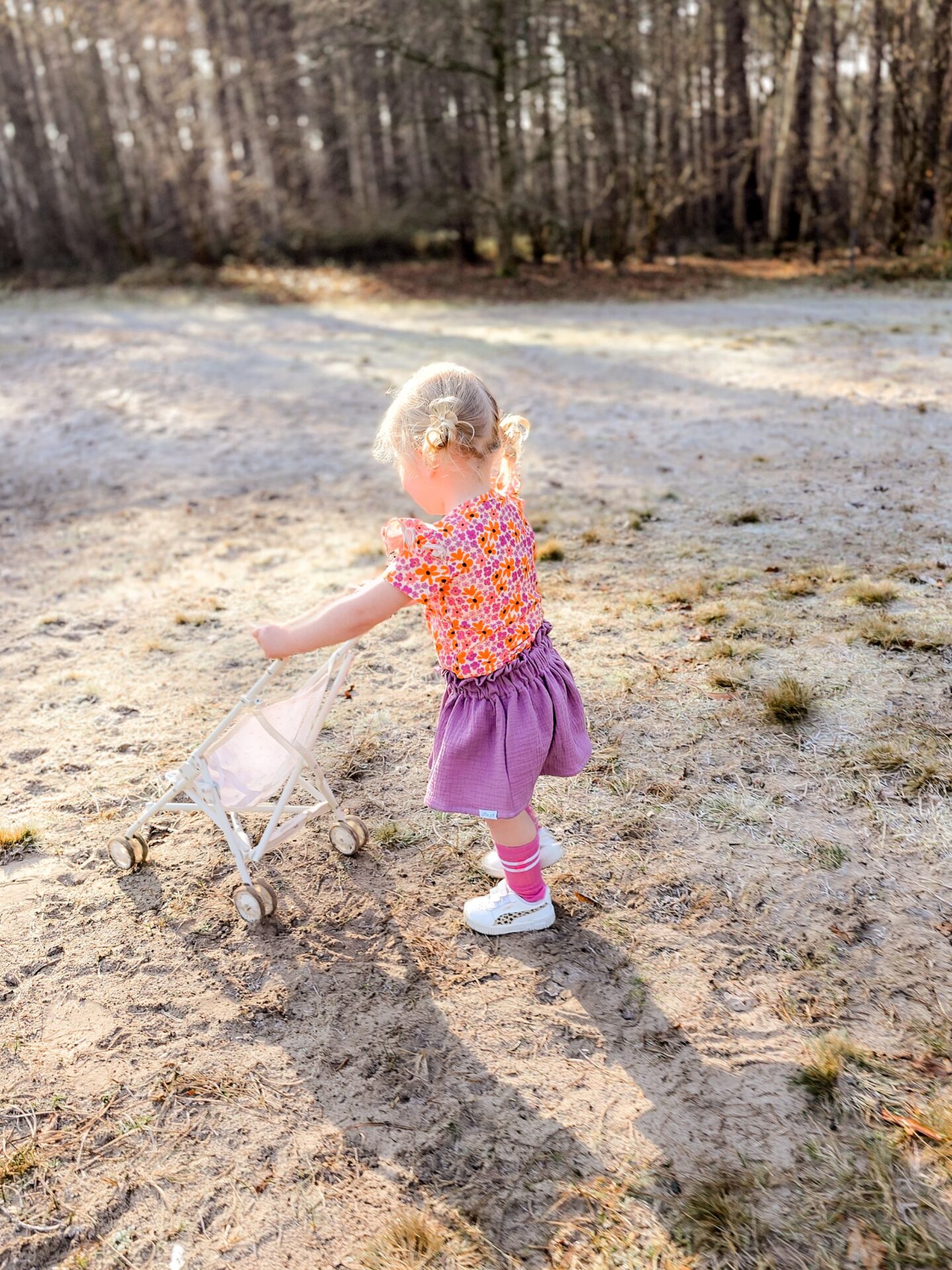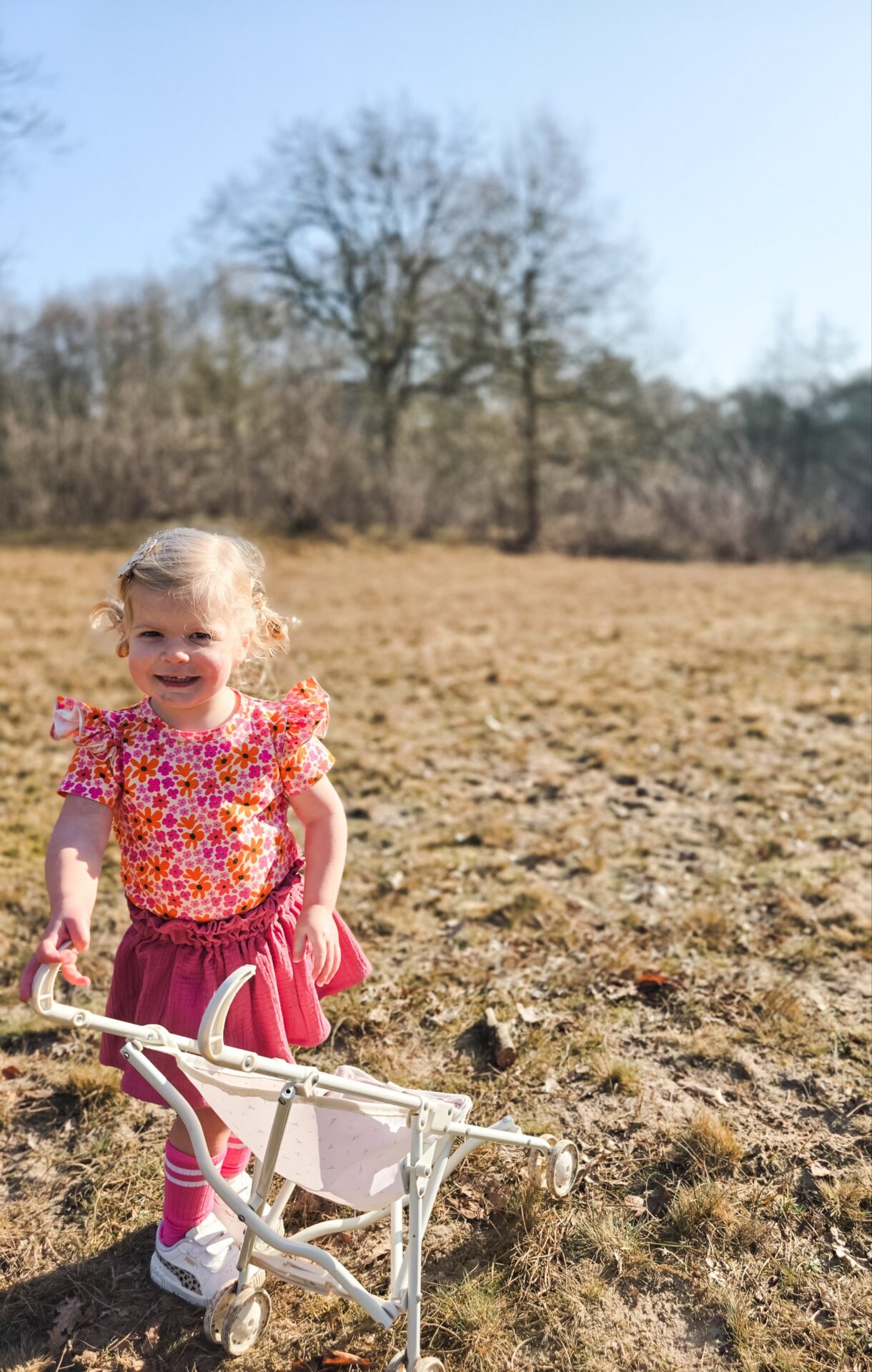 Match dit vrolijke shirtje met paperbag rok Pika en Lara of kies voor de bloomer Yara. Style het af met de fel roze gekleurde kniekousen.